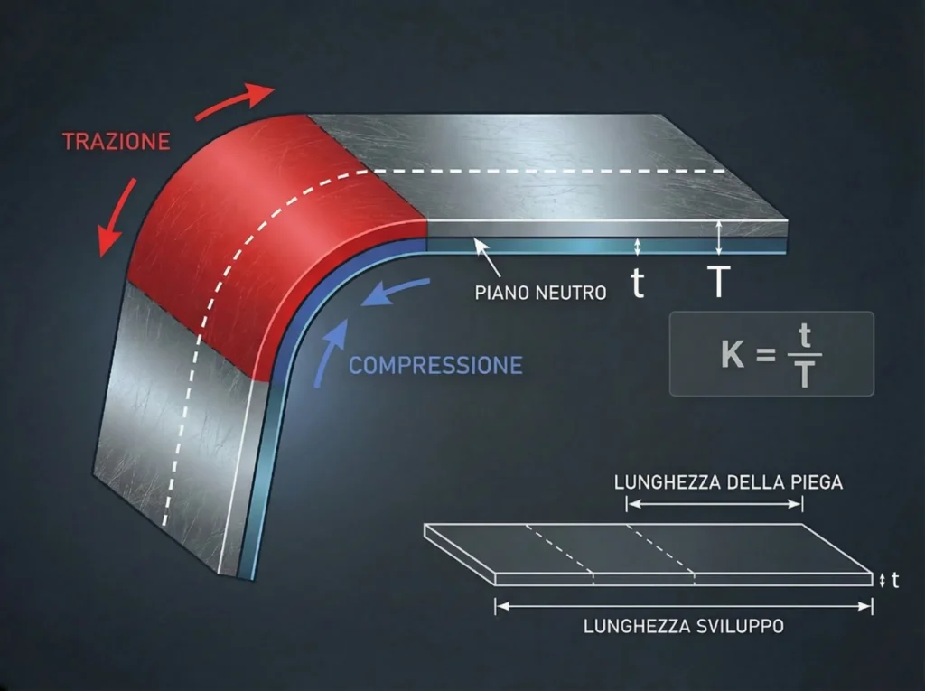 Quando una lamiera viene piegata, la parte esterna della piega tende ad allungarsi, mentre la parte interna tende a comprimersi. Tra queste due zone c’è una linea “di equilibrio”, chiamata asse neutro, che non si allunga né si accorcia.